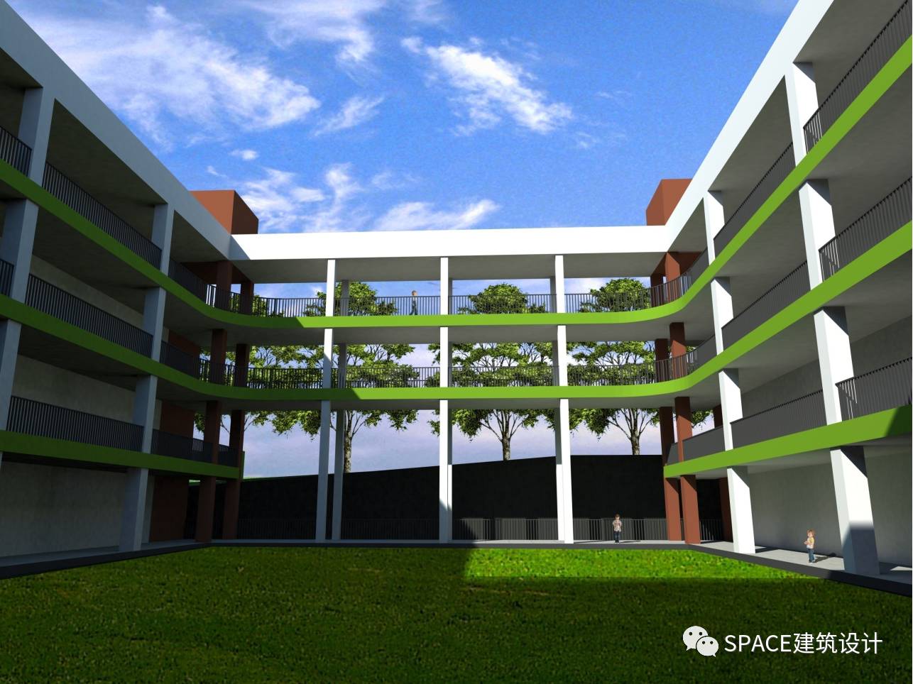 本設(shè)計(jì)在建筑空間、建筑構(gòu)圖、比例上運(yùn)用現(xiàn)代手法,同時(shí)結(jié)合建筑的特點(diǎn),局部采用清新的綠色走廊和陽(yáng)臺(tái),畫龍點(diǎn)睛。