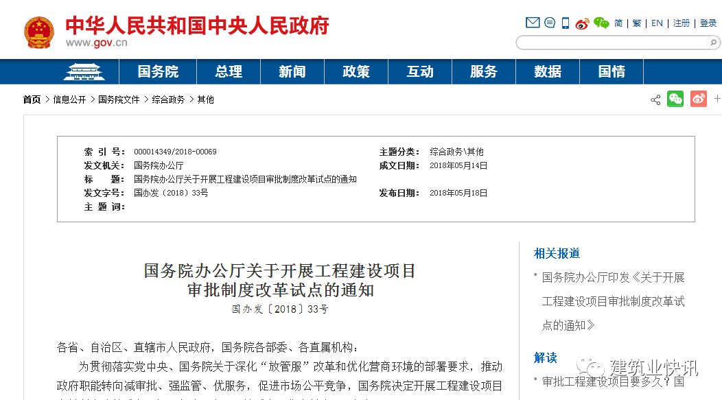 2018年5月18日,國務(wù)院辦公廳正式公布《國務(wù)院辦公廳關(guān)于開展工程建設(shè)項目審批制度改革試點的通知》(國辦發(fā)〔2018〕33號),將大大精簡審批環(huán)節(jié),主要包括: