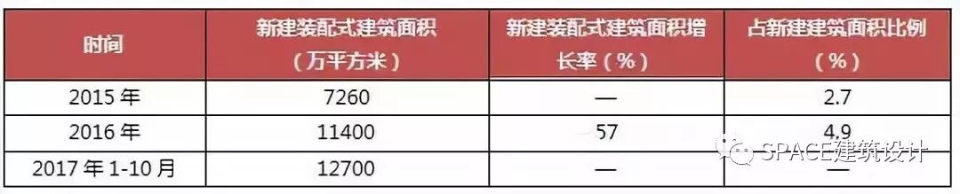 據(jù)住建部統(tǒng)計(jì),2015年全國新建裝配式建筑面積為7260萬平方米,占城鎮(zhèn)新建建筑面積的比例為2.7%;2016年全國新建裝配式建筑面積為1.14億平方米,占城鎮(zhèn)新建建筑面積的比例為4.9%,比2015年同比增長57%;2017年1-10月,全國已落實(shí)新建裝配式建筑項(xiàng)目約1.27億平方米。